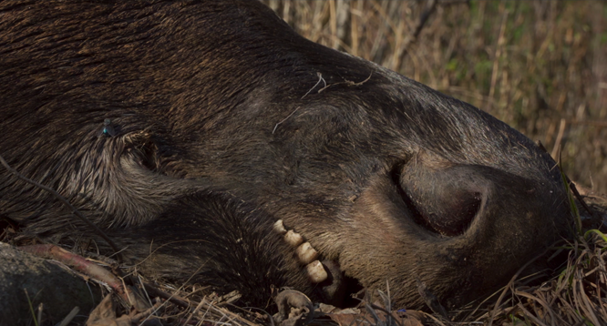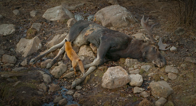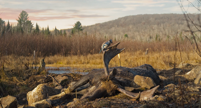 ML : Ça me fait penser… André-Line, dans ton documentaire Panache, tu filmes des chasseurs d’orignal qui réfléchissent à la mort. Robert, de ton côté, tu explores ce même thème dans Festin boréal, mais du point de vue du chassé, soit de l’orignal.