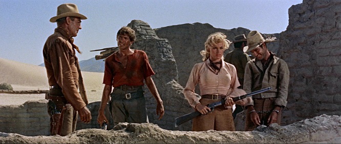 :: (De gauche à droite) Randolph Scott, James Coburn, Karen Steele et James Best dans Ride Lonesome (1959) [Sony Pictures]