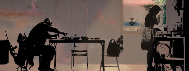 Dans leur plus récent film, Dominique Chila et Samer Najari créent un espace disjoint, fragmenté, mais parfaitement cohérent, suturé par les rêves d’ailleurs et les vues de l’esprit qui accaparent les personnages, par les coups de feu et les explosions qui les accablent jour et nuit et menacent de contraindre à l’oubli même leurs désirs les plus désespérés. Superposition d’arrière-plans peints, d’éléments crayonnés, d’images urbaines découpées et d’acteur·ice·s en noir et blanc à l’aspect stylisé qui rappelle la rotoscopie, cet espace se profile comme un no man’s land hanté par la guerre. Impossible d’identifier l’endroit exact où se déroule l’action, on sait seulement que les personnages parlent arabe, de sorte qu’on s’imagine la Palestine, la Syrie, le Liban… Tout ce qui se donne à voir dans la première scène, soit la figure d’un franc-tireur au visage obscurci, tapi devant un mur de briques recouvert de sacs de sable derrière lequel point timidement la ville, évoque une sorte d’imaginaire martial passe-partout qui nous rappelle l’étalement de la terreur qui menace le monde arabe. Mais là où le couple de cinéastes excelle, ce n’est pas tant dans le spectacle d’une violence tentaculaire que dans le parallélisme probant que développe leur scénario, suggérant un cycle de brutalité inexorable qui tourne frère contre frère, et dont les seules échappatoires sont de brèves utopies évanescentes.