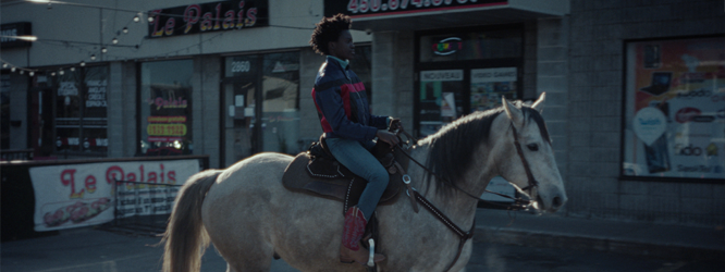 Fantas repose principalement sur une seule image, une image forte, celle d’une cowgirl qui chevauche sa noble monture dans les rues d’une banlieue générique, remplaçant les bagnoles monstrueuses qui y circulent normalement. Une vignette de sérénité salutaire dans notre océan de grisaille moderne, tirée d’un fait divers imprimé dans l’imaginaire de la cinéaste Halima Elkhatabi. Le samedi 3 mai 2014 vers 16 h, une cavalière du SPVM tombe de selle alors qu’elle patrouille sur l’avenue Monkland, puis son cheval, Royal, s’enfuit en trombe et se met à courir, affolé, à travers les rues de Notre-Dame-de-Grâce. Des témoins décrivent une scène surréaliste, qu’Elkhatabi tente de recréer, dix ans plus tard, ranimant cette image mémorable de fougueuse insoumission comme un jab bien ressenti envers nos ami·e·s de la police. Comme un appel à la communauté face à ces fantassins de la division et du droit individuel, gracieuseté d’un bel appariement entre le cheval rebelle de l’histoire et les jeunes du ghetto, qui, eux aussi, parviennent ici à s’affranchir du joug de leurs « maîtres ».