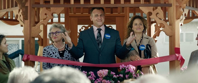 Prenons par exemple Guibord s’en va-t-en guerre (Philippe Falardeau, 2015). Aimant bien le cinéma de Philippe Falardeau mais ayant parfois quelques réticences quant à la manière dont l’immigrant n’est toujours qu’un immigrant chez lui — aussi exemplaire, attachant ou parfaitement humain soit-il —, je dois dire que cette satire politique, avec tout ce qu’elle a de situations stéréotypées imaginées pour mieux les déconstruire, pourrait très bien être accablée d’une sorte de lourdeur discursive, quelque chose d’un peu prêchi-prêcha. D’une histoire de « fish out of water », le film se double plutôt d’une rencontre empathique de l’altérité, travaillant un réalignement de la politique sur la fiction (le film a quelque chose à dire sur la politique) et de la fiction sur la politique (en disant que la politique en revanche manque de cet enchantement du monde que peut encourager la fiction). On peut imaginer qu’une direction artistique qui aurait voulu épater la galerie aurait souligné à gros traits le kitsch parfois délabré des régions, jouer d’un contraste avec l’« exotisme » de l’assistant incarné avec cette bonhommie irrésistible par Irdens Exantus, mais au contraire, ce que fait Beauparlant ici, c’est d’épaissir un peu — mais pas trop, jamais trop — la densité du trait caricatural qui sert d’arrière-plan au fond de l’air. C’est la grosseur un peu trop grosse des maillons qui enchaînent les autochtones à leur barrage routier, c’est la dégaine que se prêtent des personnages comme ceux de Patrick Huard le politicien, de Suzanne Clément l’épouse, de Micheline Lanctôt la mairesse, de Robin Aubert le camionneur qui ont « l’air de » ce qu’ielles sont déjà. C’est la barre transversale du gazebo — immense chapeau public de la discorde — qui passe sur le front du politicien. Tout est un peu synthétisé dans la pancarte électorale hilarante, « Votez du bon Guibord », avec son graphisme soigné qui sait pourtant jouer de son anodin intrinsèque. Le slogan est niaiseux. Le design de la pancarte sait l’être, mais sans s’en moquer non plus.