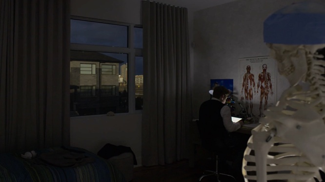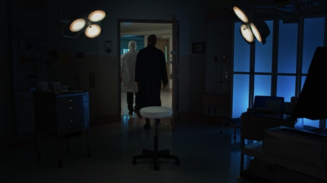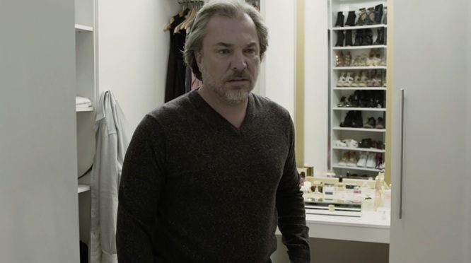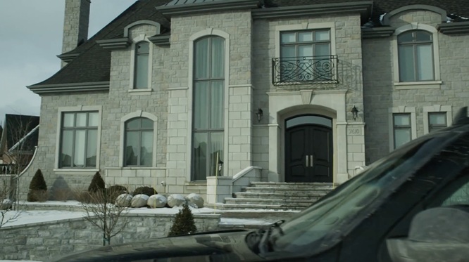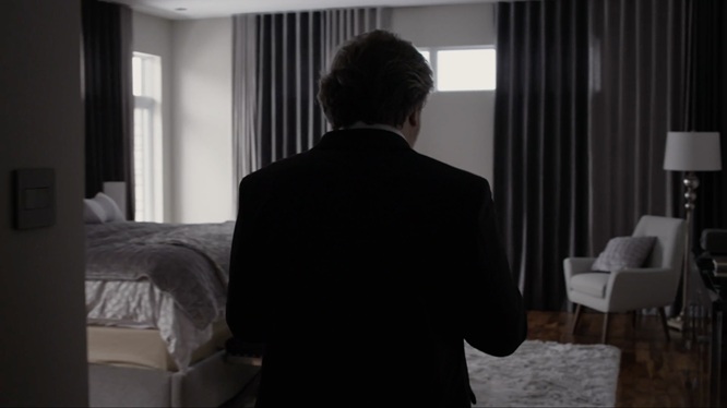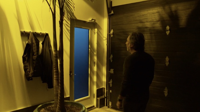 L’alliance de cette conceptualisation du décor et de la mise en scène n’est peut-être jamais plus éloquente que dans les collaborations Morin-Beauparlant, quand on pense par exemple au travail formidable derrière Le problème d’infiltration (2017), film de maison hantée exemplaire, porté par une scénographie qui se module constamment aux désirs d’une caméra fouineuse qui rôde inlassablement, dans une éternelle volonté de prolongement du malaise, sans couper, sans nous permettre de sortir du marasme morbide de la banlieue. Ça tourne, ça tourne et ça tourne, puis ça contourne les décors, cette plante dans le garage placée là, on dirait, pour que la caméra puisse mieux couler comme de l’eau, dans un refus de la segmentation qui fonctionne justement comme une infiltration qu’on n’arriverait pas à boucher. Le décor simili-gothique est entièrement rectangulaire, à l’image de cette vie perpendiculaire qui enferme dans les manières et les attentes, avec des fenêtres en quadrilatères, des portes placées en surcadres, une esthétique de maison de riche dépouillée faite comme un cadre qu’on ne peut que penser en voyant qu’elle est habitée par le même vide dévorant qui est en train de gruger le cœur du personnage de Christian Bégin. Ça prend de l’espace vide pour qu’un liquide puisse s’infiltrer et la direction artistique d’un Problème d’infiltration accomplit justement ceci en établissant un large canevas parfaitement soigné, parfaitement creux, dans lequel la misère psychique du héros a tout le loisir de tourner en rond et de se laisser pourchasser par la caméra ; c’est là la grande rencontre entre les concepts narratifs du cinéaste et les motifs visuels de la directrice artistique.