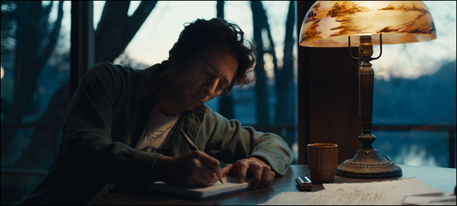 Les fans de l’artiste connaissent bien l’anecdote : après sa tournée pour The River en 1981, Bruce Springsteen s’enferme dans sa maison à Colts Neck au New Jersey pour se reposer dans la solitude et trouver l’inspiration pour son prochain album. Un soir, il tombe sur une télédiffusion du Badlands (1973) de Terence Malick, et il se fait aussitôt happer par l’histoire de Charles Starkweather, qui a tué dix personnes entre 1957 et 1958 en fuyant les autorités avec sa copine. C’est la genèse de Nebraska, l’album comme la chanson, qui reprend le récit du meurtrier, mais à la première personne. La promesse de Springsteen: Deliver Me From Nowhere, c’est d’abord de nous amener dans cette chambre et de représenter ce qui a mené à la création d’un album culte. Les fans comme moi seront ému·e·s de voir Springsteen (Jeremy White Allen) découvrir le film à la télévision, effectuer des recherches en bibliothèque, puis se pencher sur son carnet de notes pour écrire quelques lignes. Mais les choses se gâtent rapidement, lorsque ses souvenirs d’enfance refont surface, et que, pris d’une inspiration soulignée par une musique emphatique, il efface les « he » et les « his » de son texte pour les remplacer par des « I » et des « my » — en une scène, le film réduit Nebraska à presque rien, ne laissant que la platitude d’un musicien narcissique qui s’adonne à une thérapie publique.