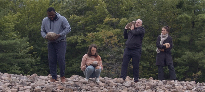 Ces réflexions s’expriment de belle façon par divers procédés et motifs récurrents : il y a ces lectures de tarot qui ponctuent la narration, Bédard Marcotte consultant ses voisines cartomanciennes pour trouver réponse, ce qui est l’occasion pour elle d’énoncer ses doutes, mais surtout de les entendre reformulés à travers ses intervenantes, qui illuminent la situation avec perspicacité. Mais il y a surtout le jeu habile et intelligent avec les images que Sisyphe évoque : perdre de vue le paysage, c’est ce qui se produit lorsque l’on est si concentré à pousser encore et encore la même roche sur la même colline qu’on finit par ne plus voir l’environnement, quand on ne sait plus comment s’y prendre pour accomplir la tâche qu’on s’est donnée, quand on n’arrive plus à voir l’évidence qui est pourtant sous nos yeux. Le titre provient d’une phrase de la pièce de Charlebois-Plante, mais il est illustré dans le prologue par une caméra instable, hésitante, qui semble tomber de son trépied en cherchant à cadrer le panorama devant elle, une image qui résume parfaitement le film à venir. On peut penser aussi à la figure de la pierre, à son immobilité, à l’effort qu’il faut pour la remuer et à sa permanence, qui renvoie à cette impression de ne plus pouvoir bouger dans les périodes de crise, sans compter la répétition de la tâche et son apparente futilité. Or, ces sentiments plus lourds sont généralement gardés en arrière-plan, éclipsés par la bonne humeur de l’ensemble, le grand sourire et l’enthousiasme contagieux du dramaturge, qui s’avère un intervenant des plus charismatiques.