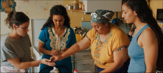 Malgré ses qualités, La petite dernière ne résiste cependant pas à certains écueils. Là où la cinéaste excelle dans la mise en scène des échanges interpersonnels, elle peine à retranscrire l’énergie des moments collectifs, qui versent rapidement dans l’illustration. La marche des fiertés, par exemple, se réduit à une suite de silhouettes et de slogans, où les personnages semblent représenter l’homosexualité plus qu’iels ne la vivent. Même constat lors de la soirée dans un bar lesbien à Paris. La caméra balaie alors la salle et les corps qui l’occupent ; tout le monde danse et chante, en chœur et en boucle : « Vive les lesbiennes ! » Si l’on ne peut qu’adhérer au message, on regrette la dimension catalogue d’une scène qui s’attache davantage à montrer un panel de personnes queers qu’à les faire exister. Le personnage de Fatima frôle lui-même ce risque : là où le livre donnait à lire et à entendre le flux de ses questionnements intimes sur son identité homosexuelle, le film tend à enfermer sa protagoniste dans une intériorité mutique. L’émancipation passe ici presque exclusivement par l’exploration sexuelle, au risque de réduire l’expérience lesbienne à cet unique prisme. Si le conflit avec la religion ou la famille est bien présent, notamment dans les scènes à la mosquée ou dans la cuisine familiale, parmi les plus réussies du film, celui-ci demeure fragmentaire et n’irrigue pas l’ensemble du récit.