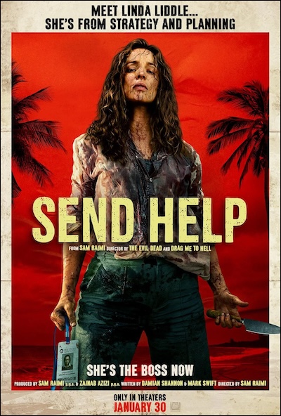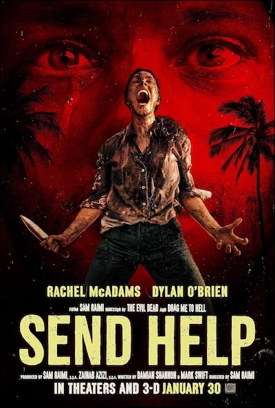 Du haut de ses 66 ans, Sam Raimi n’a rien perdu de son énergie, de son flair, de sa gaminerie. Sa caméra hyper dynamique, ses excès gore et sa mise en scène d’action truculente, burlesque et viscérale, couplée à la musique orchestrale du vétéran Danny Elfman, sauront ravir les amateur·ice·s de la première heure. Send Help n’est pourtant pas vraiment un film de genre, du moins un film de genre pur. Il s’agit plutôt d’un amalgame frankensteinien, d’un mélange d’action, d’horreur, de comédie romantique, de cinéma d’aventures, de thriller et de satire sociale, un cocktail éclectique garant d’un horizon d’attente raboteux qui recèle moult surprises. Misant sur le charisme et le dévouement de deux interprètes en grande forme (Rachel McAdams et Dylan O’Brien de la série Teen Wolf), le scénario propose un huis clos insulaire bâti sous le prisme des relations de pouvoir en milieu corporatiste, un angle opportun et pertinent qui réserve quelques tournures réjouissantes pour les cols blancs lésés et les anticapitalistes de ce monde. Presque de facto, il s’agit aussi d’une caricature du patriarcat, dans un processus d’émancipation de la pauvre femme face à son riche patron, d’un fantasme de libération féminine qui reste malheureusement balisé par les codes du cinéma de genre, par la gaminerie d’un réalisateur qui joue pour son public et inscrit la transformation cathartique de sa protagoniste dans un art de la complaisance qui enchante, mais d’une façon parfois coupable.