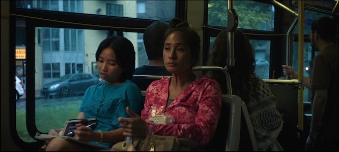 Par un mouvement de caméra qui semble suivre un regard balayant le paysage, Ailleurs la nuit nous invite à pénétrer dans la nature et dans l’obscurité. Pour ouvrir son premier long métrage, Marianne Métivier choisit un espace hybride à la tombée du jour, où un bâtiment abandonné se découpe sur les forêts et les montagnes au loin. Cet entre-deux spatial, ni totalement sauvage ni pleinement habité, donne le ton du film et devient le décor idéal pour des existences elles aussi en suspens. L’ailleurs du titre est partout : dans les images de lieux inconnus, volontairement maintenus dans le flou, comme dans l’esprit des personnages. Ceux-ci partagent tous une même hésitation entre deux endroits, comme entre deux temporalités : la fuite en avant vers l’inconnu, ou le retour vers le passé. Ce tiraillement n’est jamais formulé frontalement, mais affleure dans leurs gestes, leurs silences et leurs déplacements. En écho à cette dichotomie, le film se déploie en deux parties, habitées par plusieurs figures principales. À la campagne, Marie (Camille Rutherford) cherche un nouveau départ, tant dans sa pratique artistique que dans son couple. En ville, Eva (Kyrie Allison Samodio), une immigrante philippine, tente de rompre la solitude de l’exil, tandis que Jeanne (Amaryllis Tremblay), une étudiante québécoise essaie de donner un sens à sa vie. Sur leurs trajectoires respectives apparaissent des hommes et des femmes aux destins incertains, dont Noée (Garance Marillier), une Française en vadrouille qui vient perturber l’existence de Marie et se lie d’amitié avec Yan (Émile Schneider), un fermier solitaire qui rêve de voir la Gaspésie.