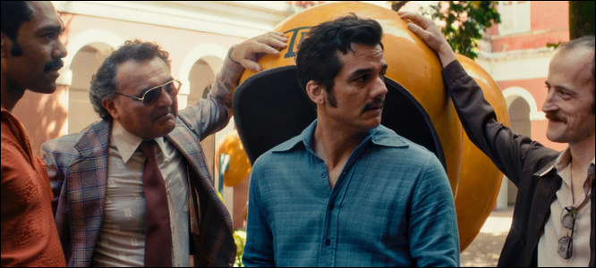 Quelle ouverture ! Elle établit instantanément et brillamment tout ce qu’on doit connaître du récit à venir : l’époque et ses règles sociopolitiques fort élastiques ; le statut incertain de Marcelo (même si l’on ne sait pas encore pourquoi, son langage corporel indique clairement malaise et frayeur) ; la structure scénaristique en flash-back (bien qu’on comprendra plus tard seulement que le montage photographique du début se situe en réalité aujourd’hui) ; et le fait qu’il y a manifestement quelque chose de pourri au royaume du Brésil…Ces regards de Marcelo dans son rétroviseur, vers ce qu’il laisse derrière lui, caractérisent toute la tension de The Secret Agent. Ses yeux inquiets resteront d’ailleurs aux aguets tout au long du film, à l’affût de présences indésirables, de la chose qui cloche dans le décor. Dans le rôle de Marcelo, Wagner Moura est électrisant, occupant l’écran avec une fébrilité contenue et une intelligence du mouvement remarquable, surattentif à son environnement et pourtant totalement investi dans ses interactions avec les quelques personnes de son entourage qui sont aussi dans le secret. On comprend amplement pourquoi le jury cannois l’a récompensé du Prix d’interprétation masculine en 2025.